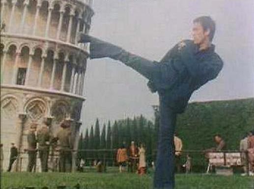 Bruce Lee sosteniendo la Torre Inclinada de Pisa con su pierna