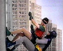 Batman le ayuda a Robin a escalar el edificio, ¿no?.