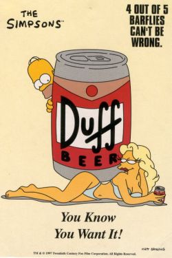 La cerveza Duff ha estado anunciada cási desde su fundación en carteles y periódicos, pero hace unos 10 años, a mediados de los 90, la compañía inició una campaña de publicidad masiva para aplastar a la competencia. Esta estrategia les llevó a incluir carteles publicitarios, en los periódicos, en la tele, e incluso en el culo de Tony (ver Padre de Familia), y su mejor baza: Duffman, un alcohólico que sacaron de la calle para convertirlo en la imagen de la marca.