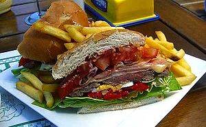 Consiste en un emparedado que contiene carne de a la plancha, con algo de jamón, lomito ahumado, lomito común o lomito canadiense (nadie sabe porqué ya que la carne es producida en Uruguay), panceta (tocino) y queso mozzarella (o musarela para los villeros), dentro del pan.
