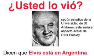 Este aun vive y varios Argentinos aseguran haberlo visto. La prestigiosa universidad de St Andreus, localizada en Pernambuco suroccidental del norte ha hecho un retrato realizado por las descripciones de aquellos que dicen haber visto al verdadero Elvis. Te preguntaras ¿Esto es coña no? NOO! Elvis es un dios no puede morir. ¿Tendra sed de venganza? Querra matar a plagiadores como Dani Martin, Elvis Costello y Elvis Crespo¿Querrá acabar con el reggaeton y con la música basura? seguro, ya estara tramando una venganza, como asesinar a 50 cent o destruir las discotecas actuales donde solo se ven putas descaradas y macarras.