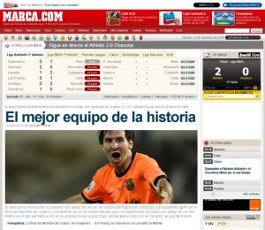 - (El Mar(i)ca se pregunta cómo estaría la Liga sin las ayudas arbitrales al Barça) javycc: "¿Dónde estarían? Pues en la misma posición estaría el Barça si no llega a ser por los robos del Madrid al Almería, Racing y Valencia... a parte, en qué quedamos, ¿Es penalty o no? Porque bien que decíais que contra el Español no era penalty (es el mismo penalty) ¿Y ahora sí? O el otro sí es penalty, el otro, el de Capdevila a Pedro también lo es porque cuando llegaba al balón Capdevila le impide llegar al balón ilegalmente. Portadas que irían mejor: ya esta bien de los lloriqueos del Madrid o ya está bien de la hipocresía madridista".