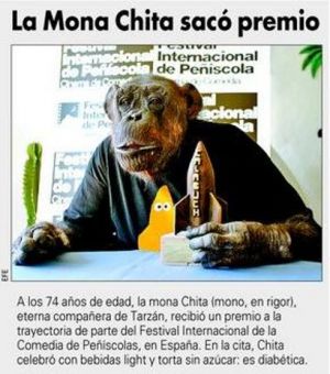 Aquella noche La Mona chita estaba de juerga en un lujoso cabaret y allí tenia que hacer una actuación de monologa, entre el publico apareció un joben llamado Tarzán llegado de Utrera,(Aspaña). El joben tenia que hacer un desnudo integral después de su actuacion, pero la insaciable Mona chita entro al camerino de este y lo seducio. No pararon de hacerlo, tan fuerte que el propio Tarzán no pudo salir a desnudarse de lo cansado que acabó, los patrocinadores de Tarzán lo echaron a la calle.Como Tarzán no tenia sitio donde dormir, la encantadora Mona chita lo acobijo en su casa. Al dia siguiente se presentaron a un casting en hollywood y les aceptaron grabando así la mitica pelicula Tarzan. Ni la mona, ni aquel inepto de utrera se lo creian, habian sido aceptados para grabar una pelicula que se haria mundialmente famosa.