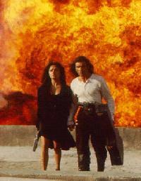 Bueno, luego está el super malo de la peli, que también es la hostia de bueno repartiendo paliza, es como el prota pero en versión de malo. Su objetivo es hacerse rico con miles de millones de dolares, los euros ni existen. Al final de la peli el bueno y el malo se baten en combate, el bueno empieza dándole la del pulpo, luego el malo empieza a ganarle (a veces el bueno recibe un disparo o una puñalada) y finalmente el prota se mosquea y después de darle palos asta en el DNI, da un salto a cámara lenta y le mete la super patada voladora del dragón legendario todopoderoso definitivo que lo deja echo un once (a veces es un puñetazo). También suele ocurrir que después de la paliza, disparos, explosiones, caída por un barranco o gran altura que a sufrido el malo, ya que el prota se iba todo contento de haber ganado, resucita para vengarse y disparar al bueno por la espalda, pero alto hay, lo que no sabéis es que el bueno tiene ojos por detrás y antes que el otro dispare, se da la vuelta, se saca una pistola de los calzoncillos y sin apuntar le mete un tiro en toda la frente. Y colorín colorado, el prota se larga con la piba, todo masacrado de disparos, hostias y puñaladas, tranquilos, en su casa ya se pondrá un par de tiritas y como nuevo.