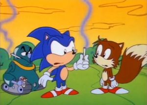 Típica escena de la serie Las Aventuras de Sonic El Erizo, y ya vemos por qué ésta serie animada fue tan popular!!!