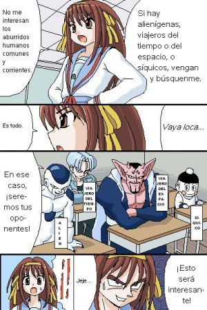 - Haruhi quiere ver algo diferente en su vida, pero todas las cosas diferentes las recibe Kyon. Si Kyon escribiera un libro sobre esas vivencias, Haruhi elevaría su cosmos de tal manera que la genkidama y la muerte por el uso del Geass combinadas serían cosa de niños.