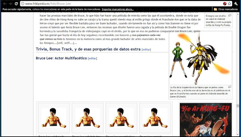 Otra cosa, desde ahora ayudare un poco expandiendo el anexo de Bruce Lee, y estaba empezando a pensar en crear Academia de Lucha de Bruce Lee, que es como la escuela donde estudiaron Liu Kang y esos clones del maestro Lee, que en paz descanse, de hecho he visto sus películas de artes marciales pero se me hace un poco aburrido que haya hecho tantas, digo, no es que no me gusten, sino que es un poco repetitivo el storyline.