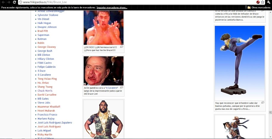 - A todo esto ¿por qué le ponemos tanta atención al artículo Shapo/Gñapero, Dancob, yo y creo que otros más? Porque queremos que sea perfecto, por eso insistimos con este. El 99% de los artículos nos la pela, nos vale madres, nos chupa un huevo o como se diga en tu país. Si le echamos el ojo a este es porque tenemos planes secretos que no te podemos decir porque nos golpean los que no deben ser nombrados. En realidad ya te lo dijimos: queremos que Bruce desplace a Chuck. Cada vez que vemos un n00b que lo nombra decimos FFFFFFFUUUUUUUU-. ¿Te acuerdas que nominé el artículo de Lao-Tse como candidato a destacado? ¿Y que te dije que serviría como modelo de lo que queremos para los artículos? Lo mismo corre para este. Si te fijas, Lao tiene una lista a dos columnas pero no tiene imágenes encimadas, está oxigenado (se ha vuelto mi mantra).